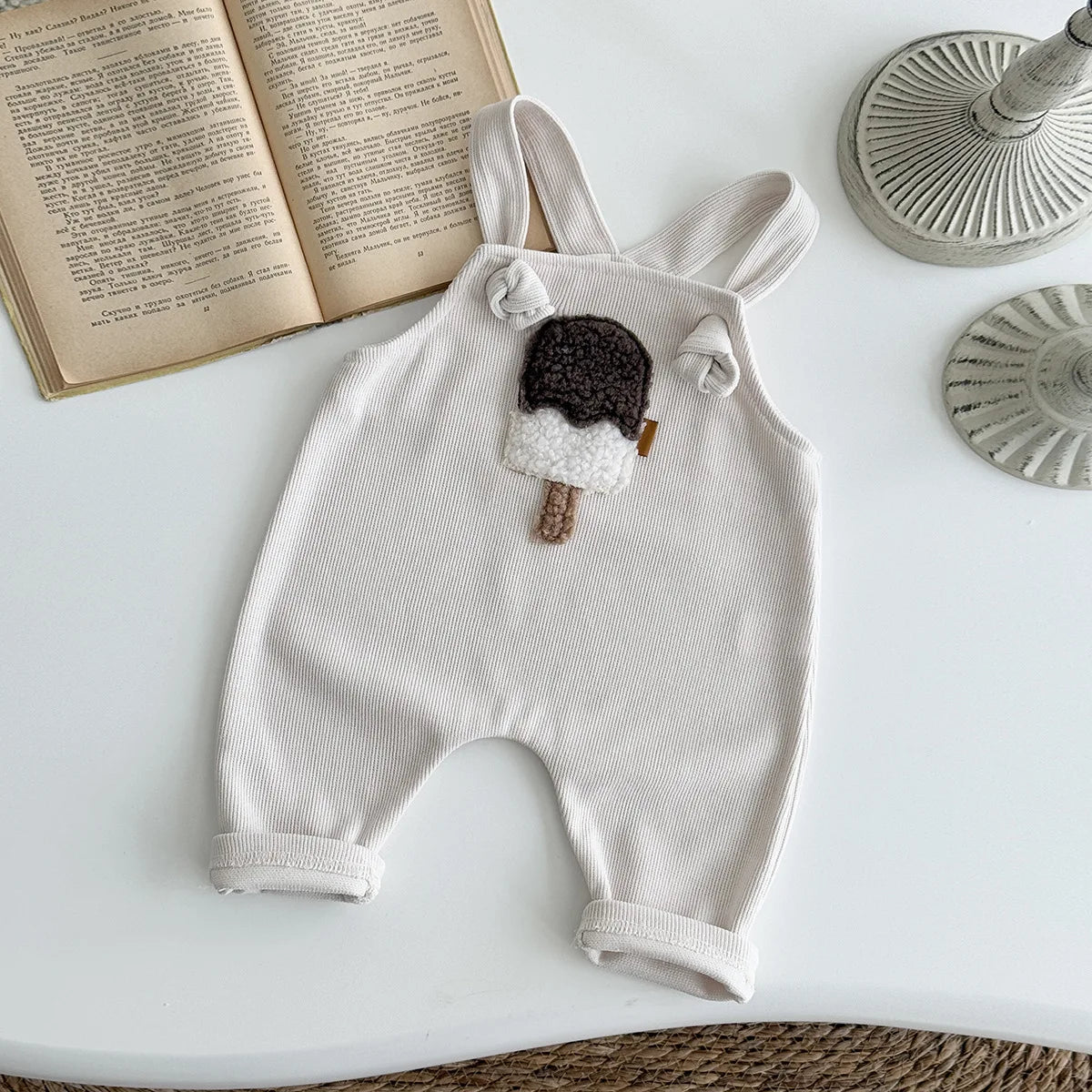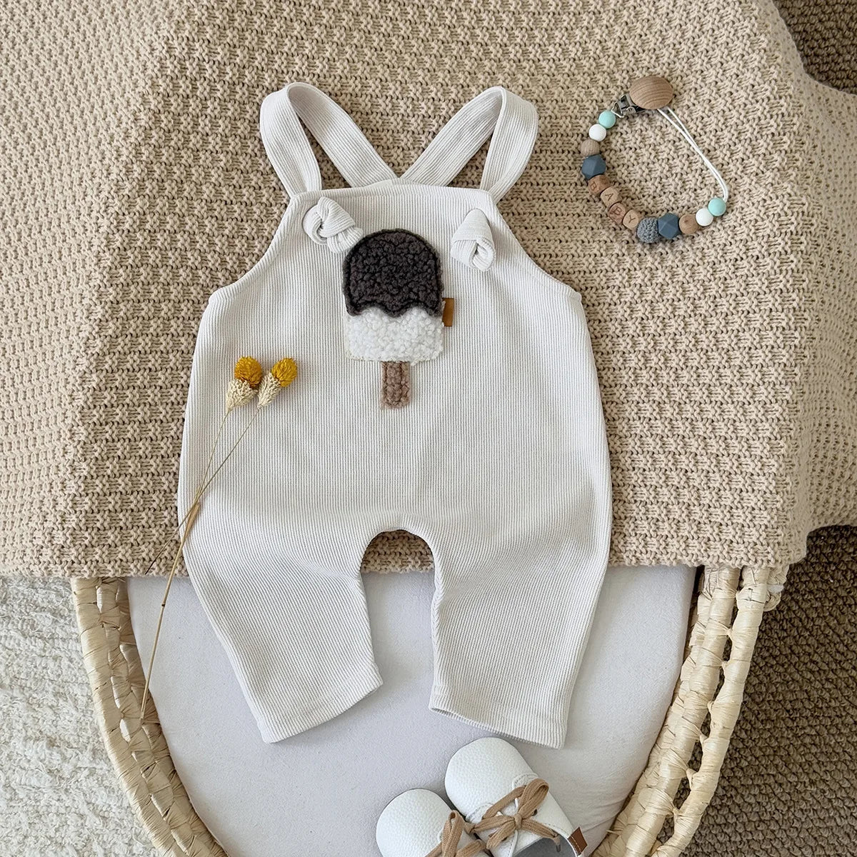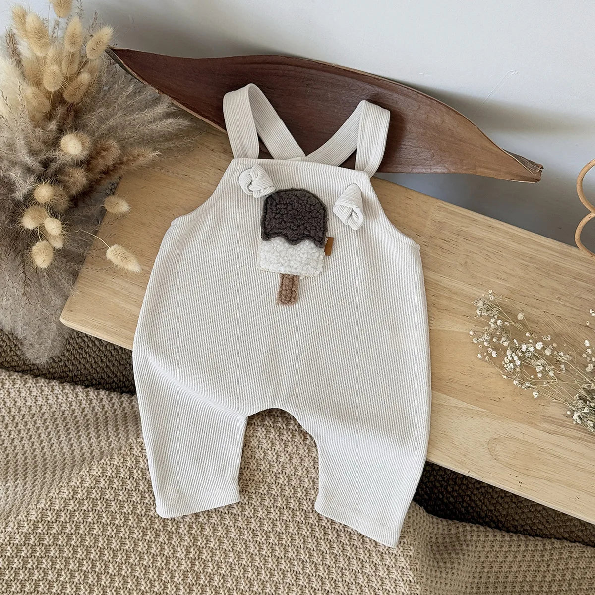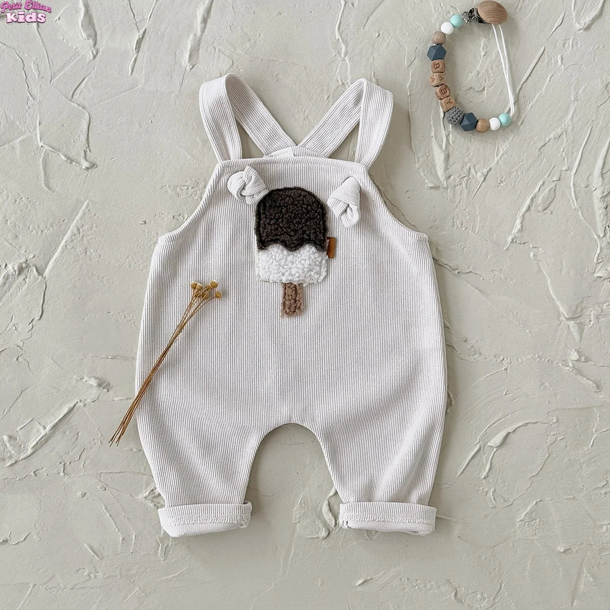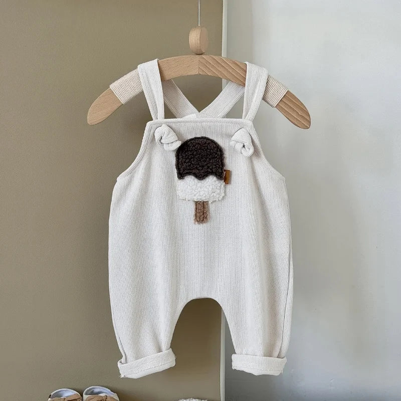 Adorable ice cream patch adds a playful, sweet touch to the romper. Suspender design ensures easy wearing and a comfortable fit for active babies. Ideal for warm weather, keeping your baby cool and comfortable. Tailored to ensure a snug and cosy fit.
